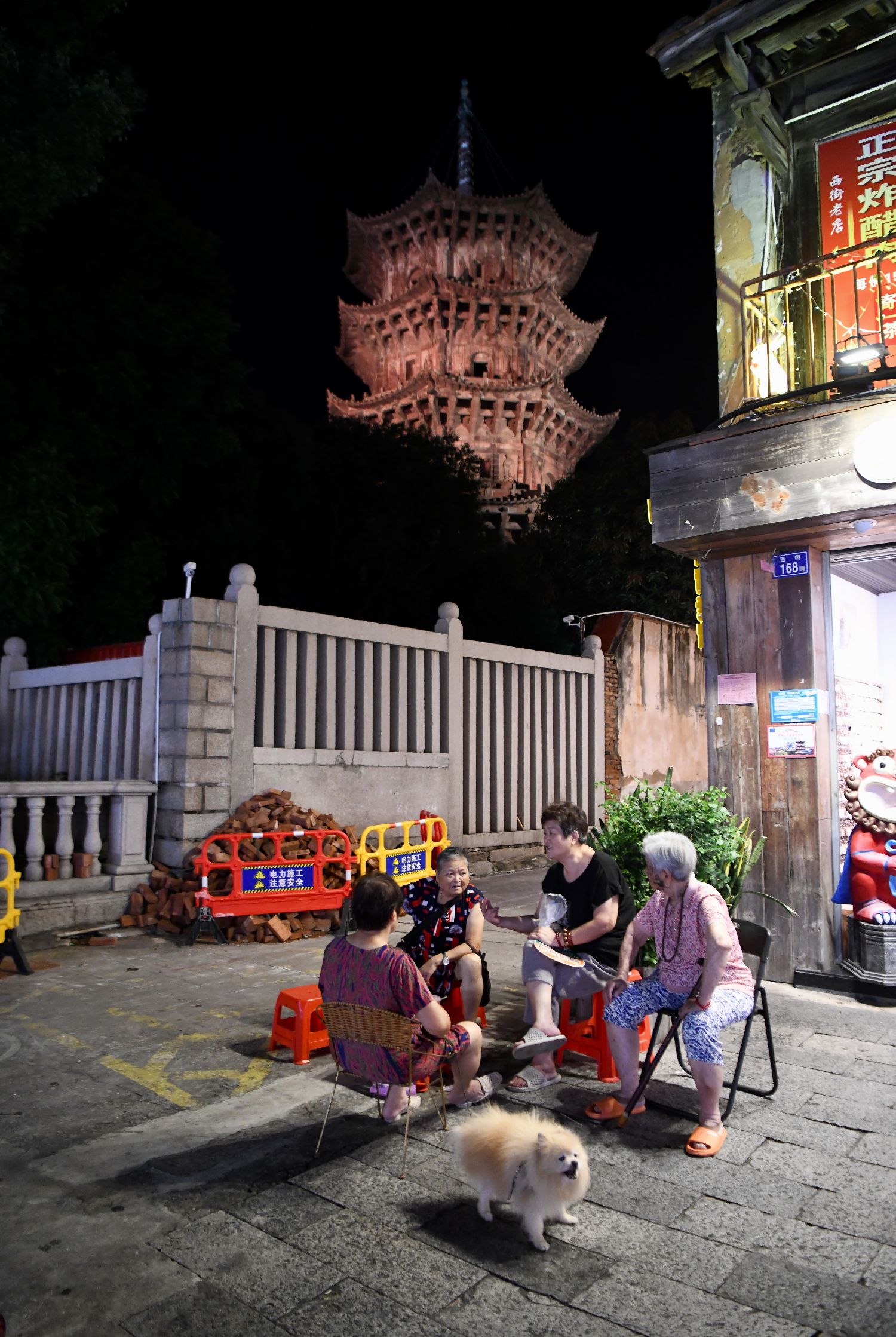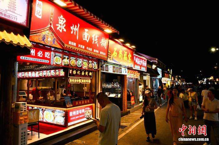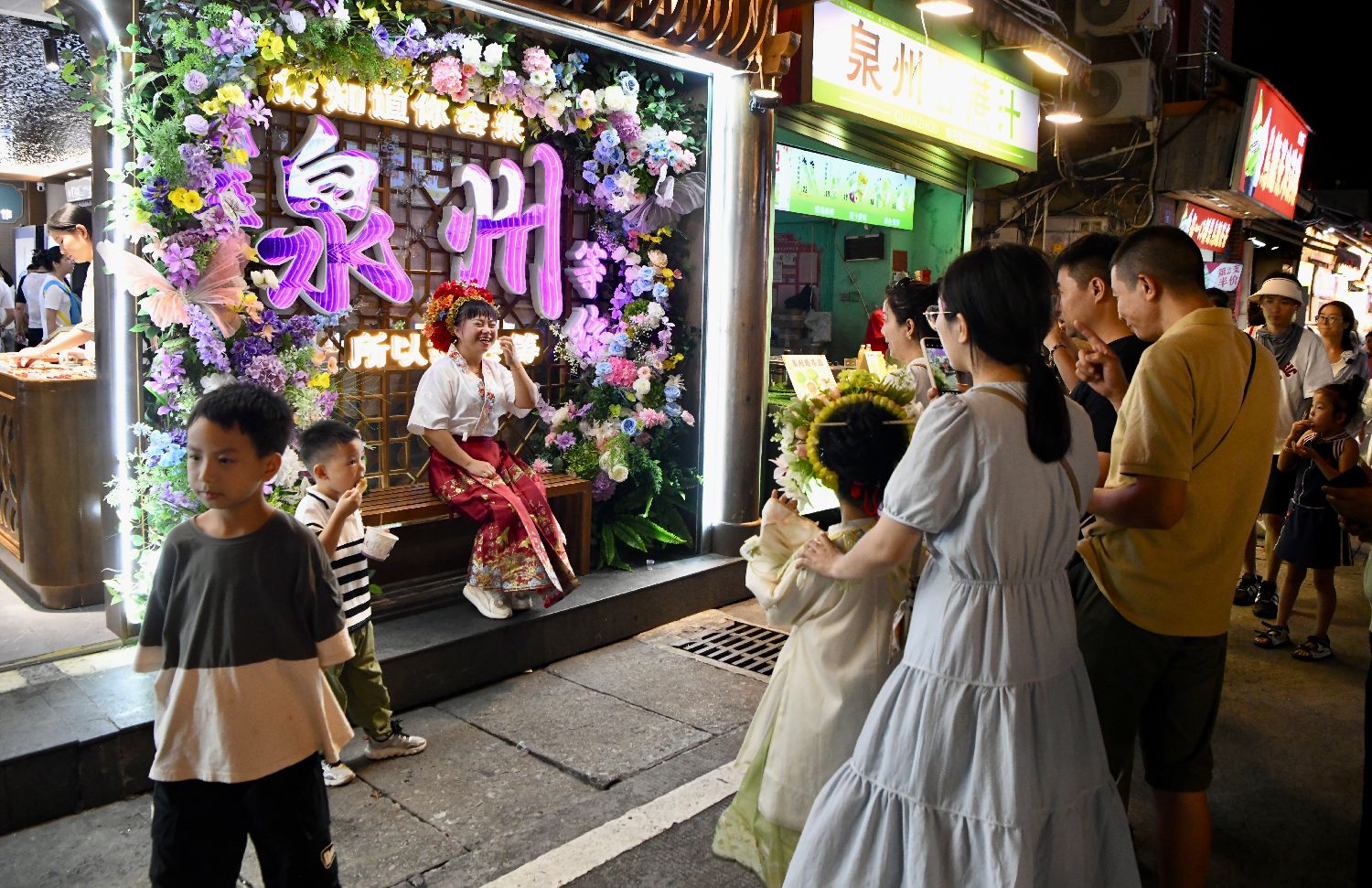 7月23日晚,在福建泉州,游客在千年古街——西街拍照打卡。西街是泉州最早开发的街道和区域,自唐朝成街已超过1300年。(图片来源:中新社)