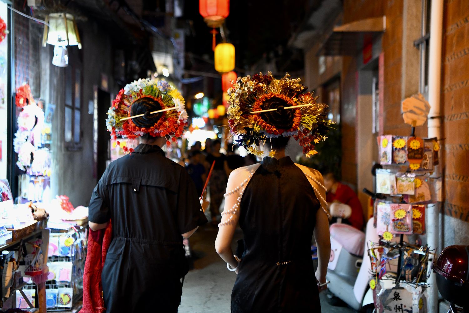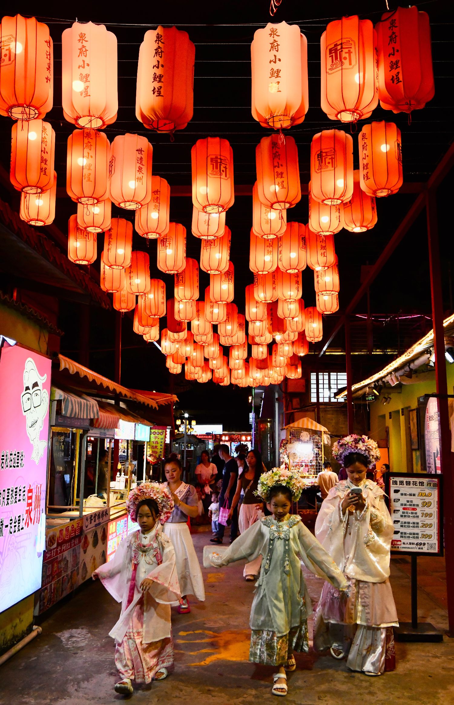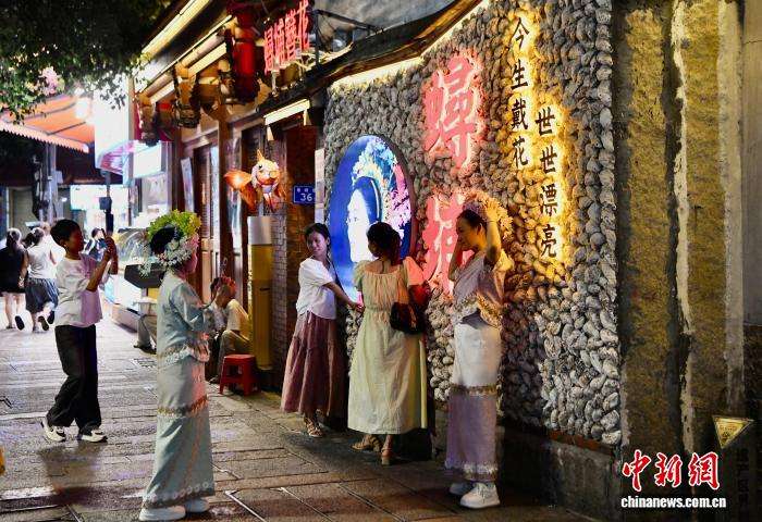 这里有传统的闽南红砖古厝,也有近现代的骑楼和番仔楼,这里还保留了地道的泉州风味美食,吸引众多游客前去品尝。图为7月23日晚,在福建泉州,游客簪花围游览西街。(图片来源:中新社)