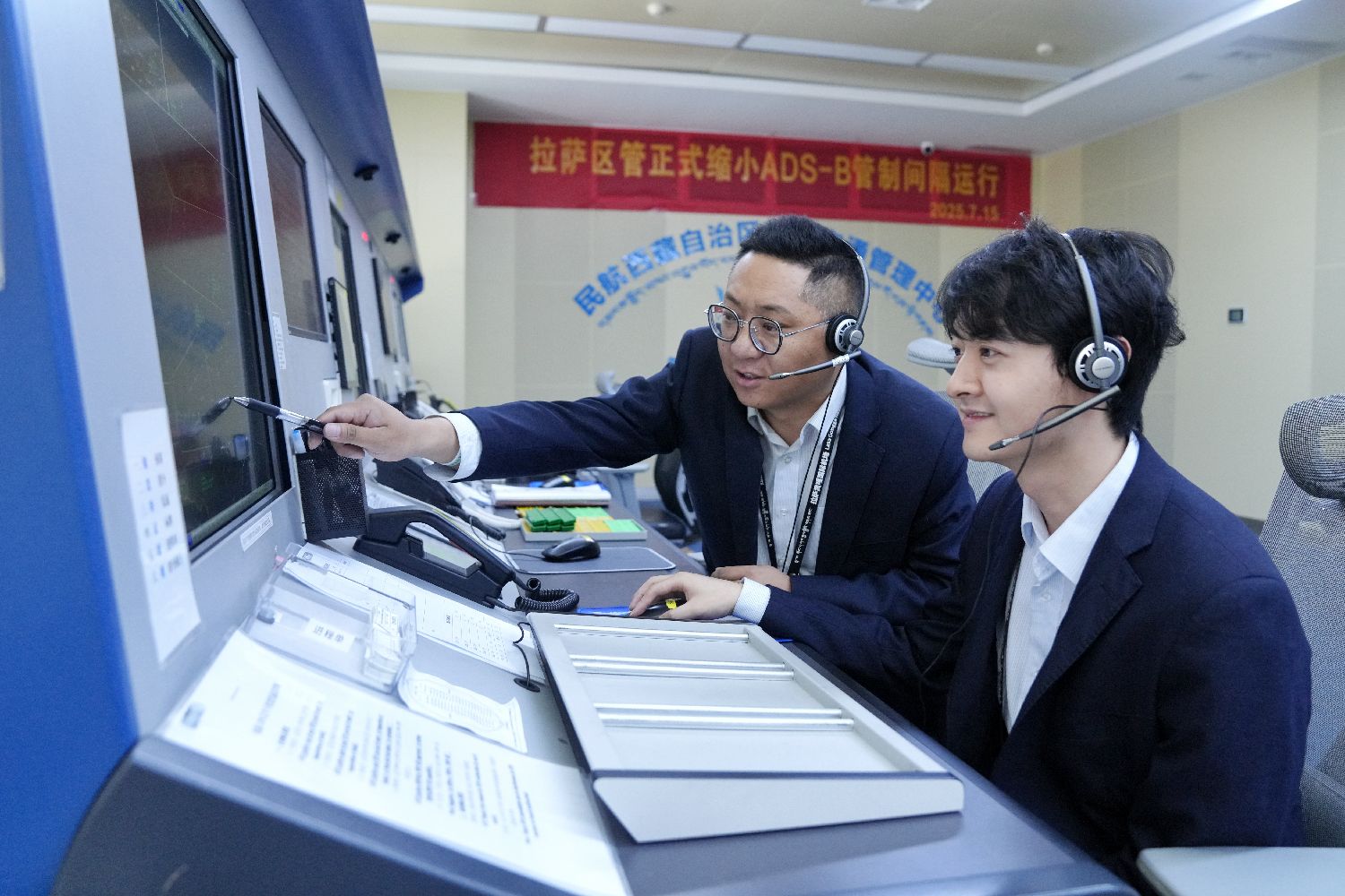 7月22日,区域管制员强旦(左,藏族)指导见习管制员王轩(右)发布指令。西藏地处高原地区,气象复杂多变,对区域管制员的综合协调应对能力要求高,见习管制员的能力提升离不开师傅的殷切指导。