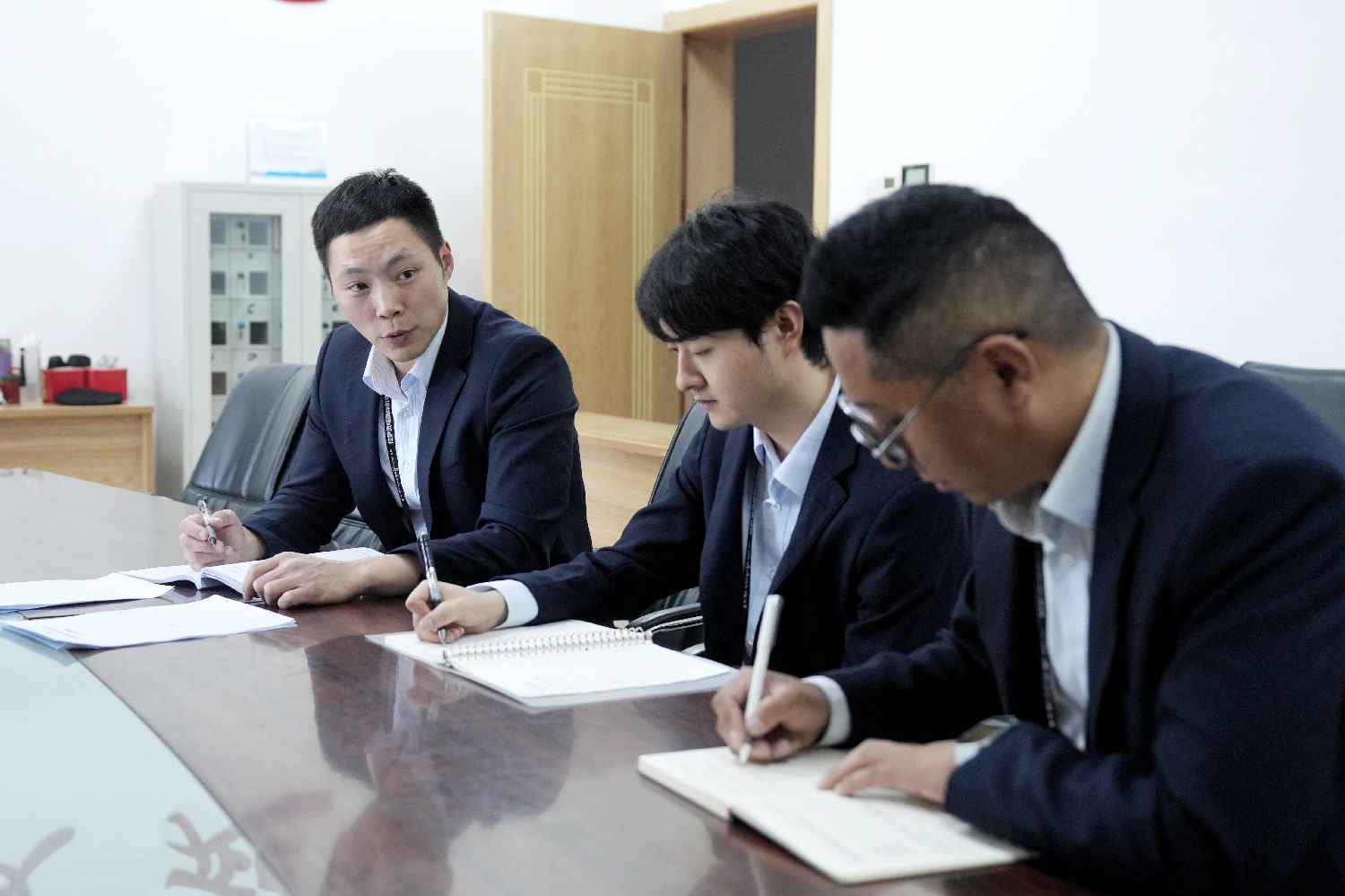 7月22日,西藏空管中心区域管制带班主任张斌(左)与管制员强旦(右,藏族)、见习管制员王轩(中)召开班前讲评,提示当日地区空域内的注意事项、管制要点。