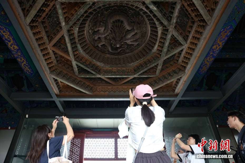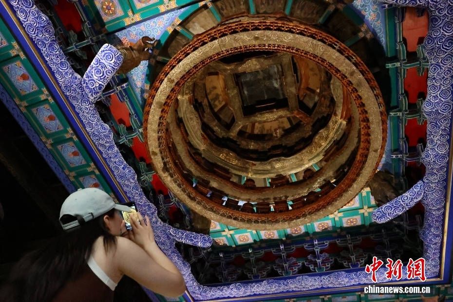 7月24日,游客在先农坛拜殿内拍摄藻井。(图片来源:本文图片均据中新网)