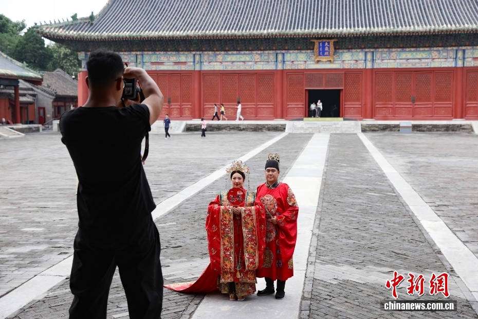 7月24日,游客身着古装,在北京古代建筑博物馆(先农坛)内拍摄写真。