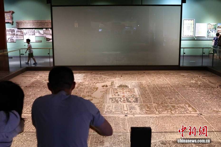 7月24日,游客在北京古代建筑博物馆(先农坛)太岁殿内观看北京城沙盘模型。