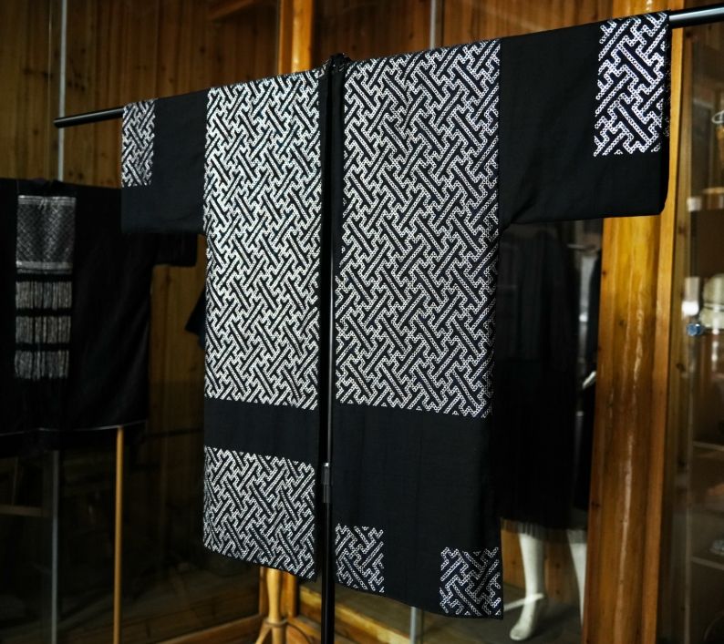 因工艺繁杂,一件普通锡绣服饰至少需半年,盛装则需两三年时间。采访期间,龙女三九展示其历时两年完成的华服:藏青土布为底,千针万线间,金属锡被巧妙缀满,交织出繁复而秩序井然的几何纹样。由于色调与质感的相撞,看上去古朴又时尚。
