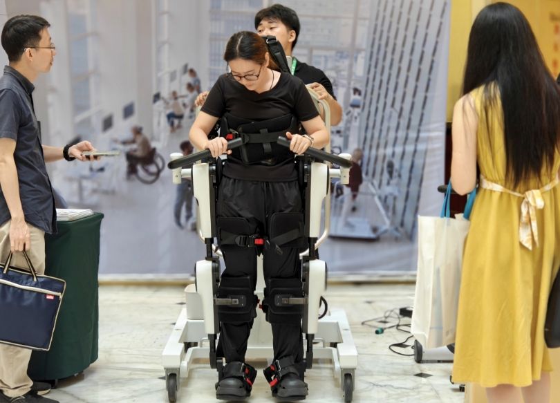 图为与会人员体验下肢康复机器人。(图片来源:中新社)
