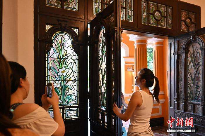 7月26日,广州市海珠区潘氏大院的玻璃窗花吸引游客拍照。