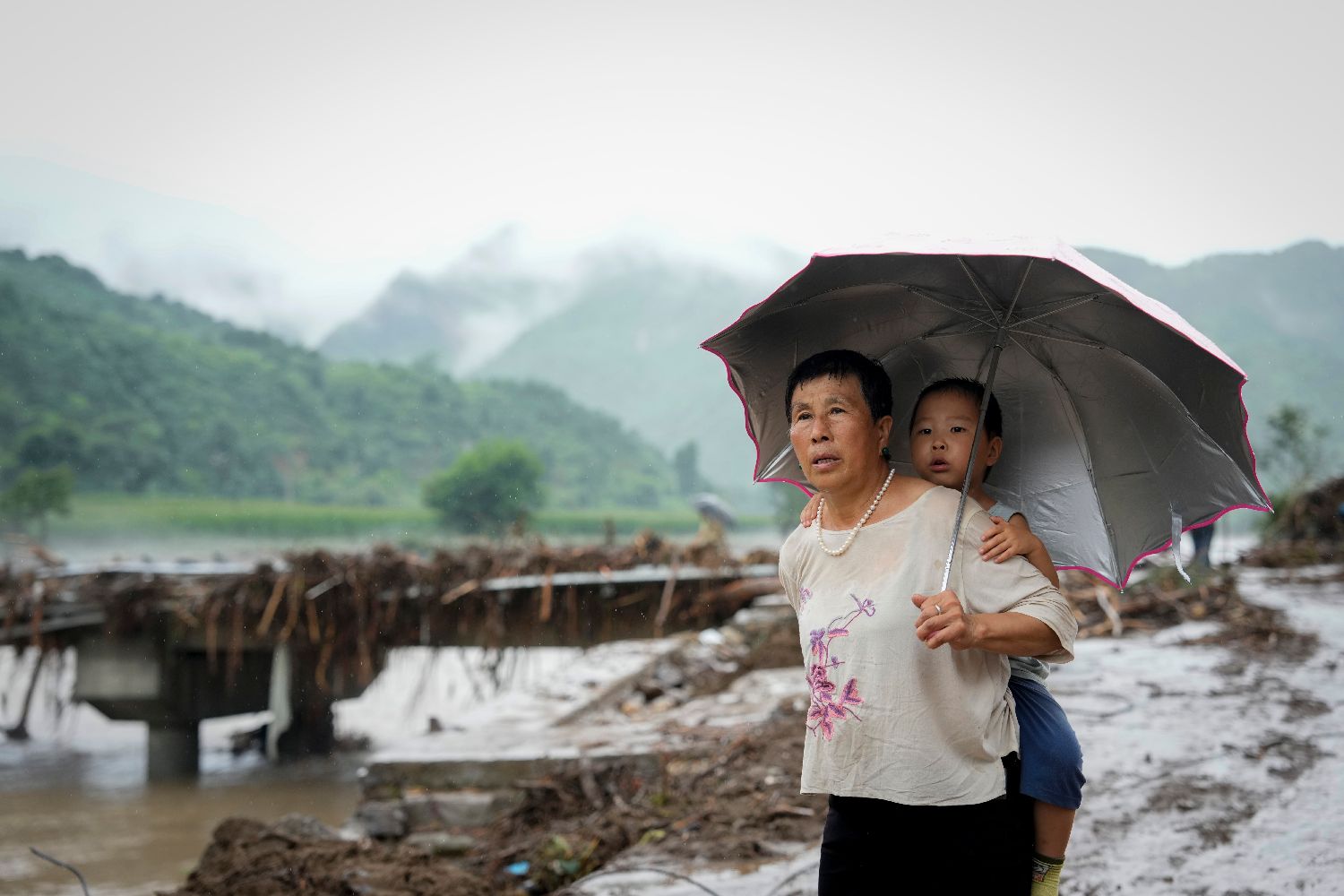 7月28日,在琉璃庙镇偏道子村等待转移的受灾民众。