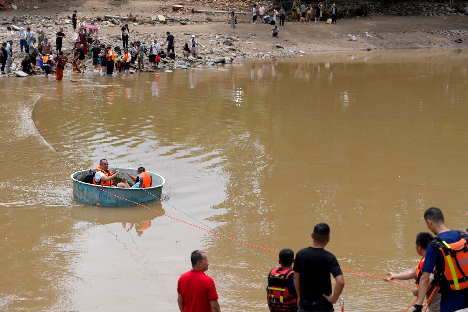 7月28日,在琉璃庙镇碾子湾村,受灾民众乘坐塑料大盆转移到安全地点。