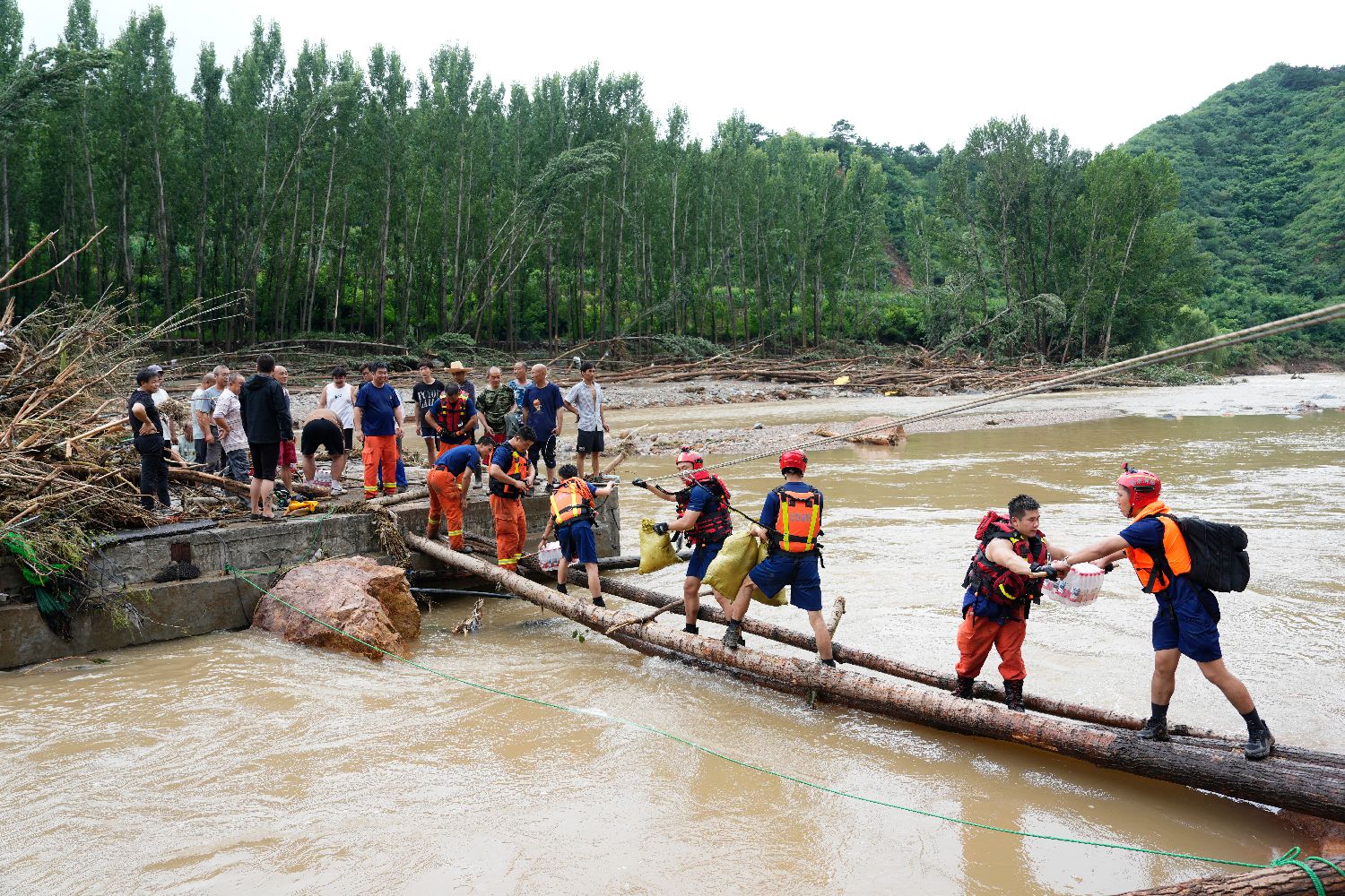 7月28日,消防队员通过临时搭建的木桥运输物资。