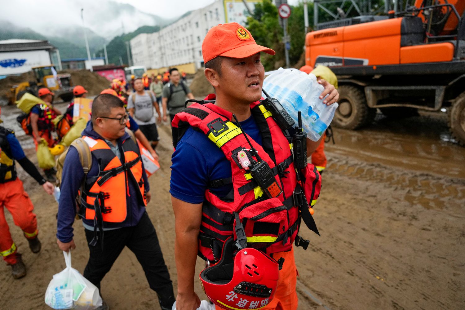 7月28日,消防队员徒步携带物资进行救援。琉璃庙镇一部分村子分布在更高的山上。目前部分上山的道路车辆无法通行,消防员们只能徒步爬山前去救援。