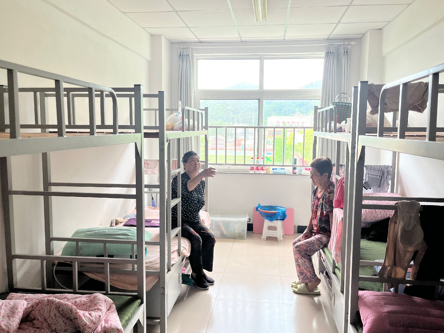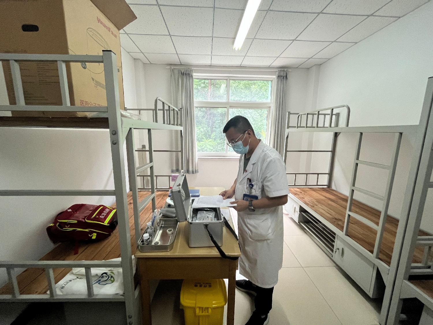 中新社记者在现场看到,宿舍内配备上下铺共8个床位以及桌椅;两层楼分设男、女浴室,以及开水供应处,提供生活保障;石城镇社区卫生服务中心医生为村民测量血压、记录基础病,24小时守护村民平安。