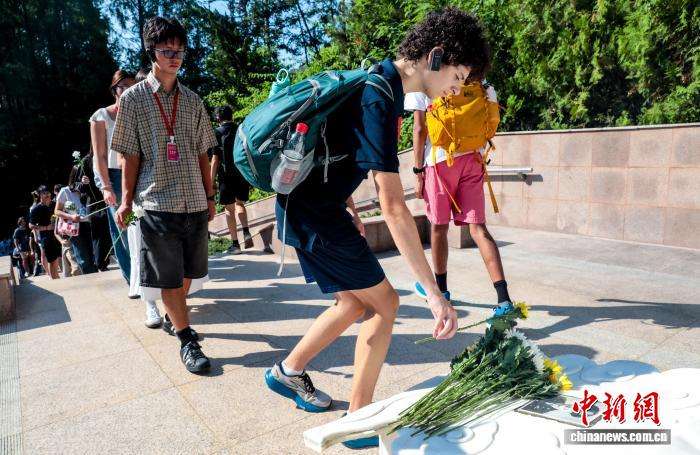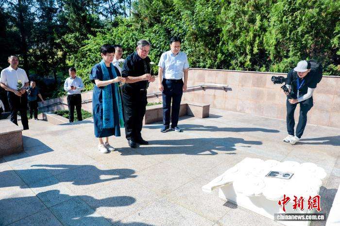 7月28日,在湖北红安,美中航空遗产基金会主席杰夫·格林带领“飞虎队”老兵后代以及“飞虎队”友谊学校青少年一行,前往位于李先念故居纪念园里的格伦·本尼达墓敬献鲜花。