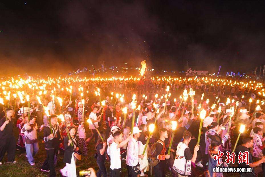 图为入夜后威宁各族民众和游客手持火把围着篝火尽情欢跳。