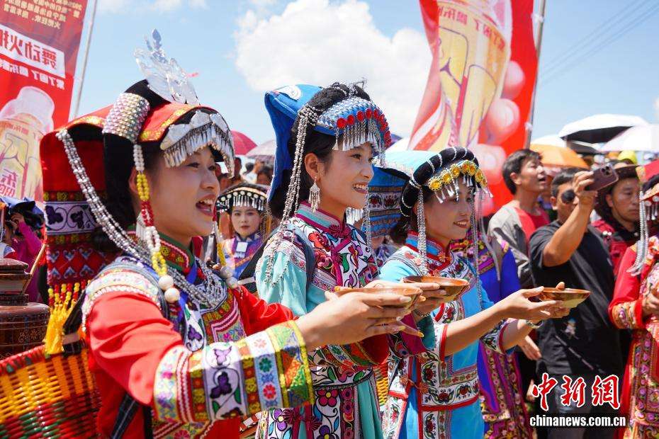 图为身着盛装的彝族同胞端起美酒迎宾。