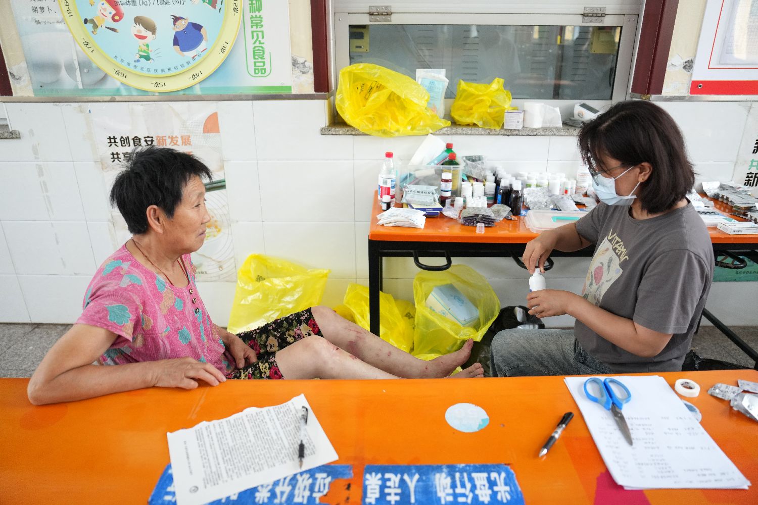 据介绍,截至28日21时,北京市密云区共转移19个镇街189个村6363户16934人。在村委会、中小学、民宿户、农家院、高处民房等点位设立临时安置点227处,配备生活物资,保障群众住宿、饮食、医疗等方面基本需求。图为7月29日,在北京市密云区太师庄中学居民安置点,太师屯镇社区卫生服务中心的医生(右)为居民处理伤口。