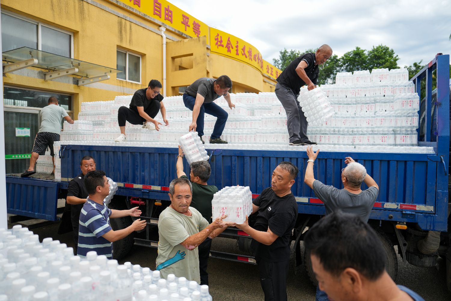 7月29日,在北京市密云区太师庄中学居民安置点,民众搬卸饮用水。7月26日12时至27日2时,北京市密云区发生强降水天气,全区平均降雨量达到73.5毫米。本次降雨过程比较集中,局地性强,暴雨导致多个村子的道路、电力、通信中断。