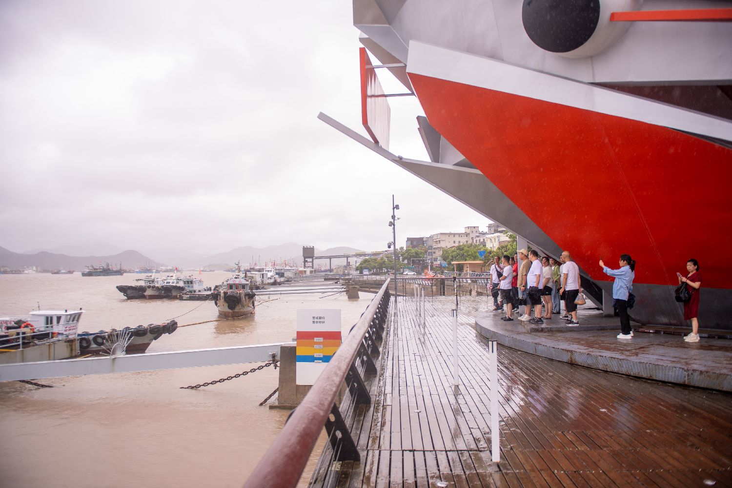 7月29日,游客在宁波市象山县石浦港游览时避雨。