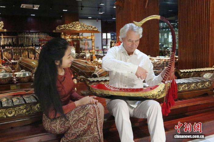 图为访问团成员体验演奏缅甸乐器“弯琴”(Saung-Gauk)。