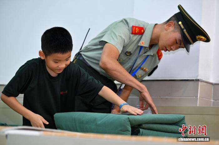 图为武警官兵教授小孩子叠军被。