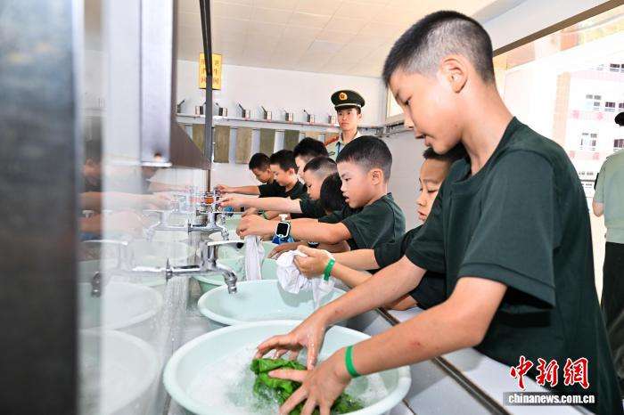图为小孩子们在军营体验洗衣服。