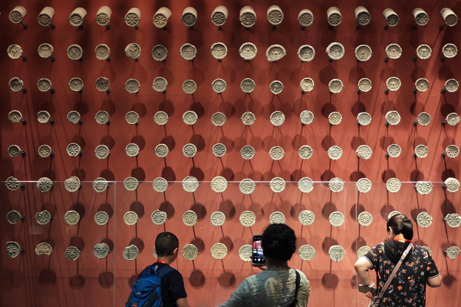 7月30日,观众在南京六朝博物馆内参观展陈的六朝瓦当。正值暑期,南京文博场馆迎来参观热潮。(图片来源:本文图片均自中新社)