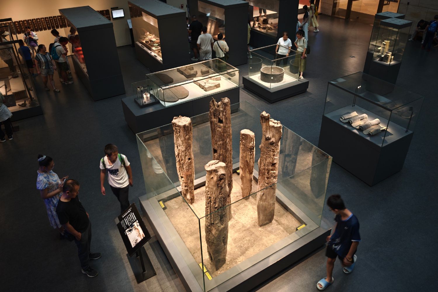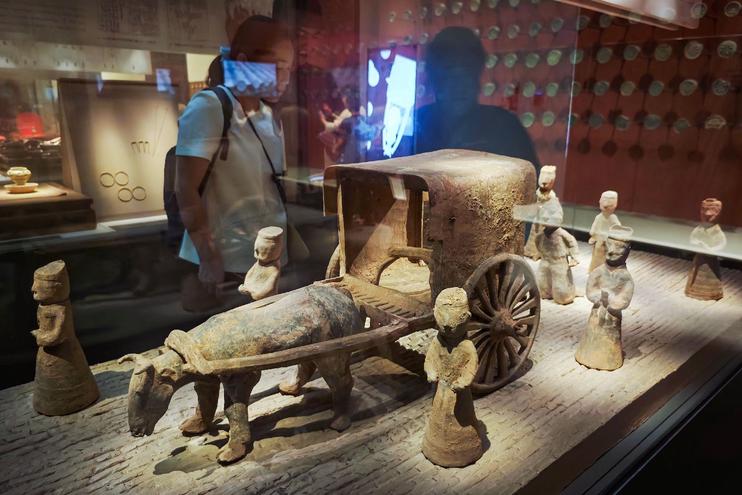 7月30日,观众在南京六朝博物馆内参观展陈的陶牛车及陶俑群等文物。