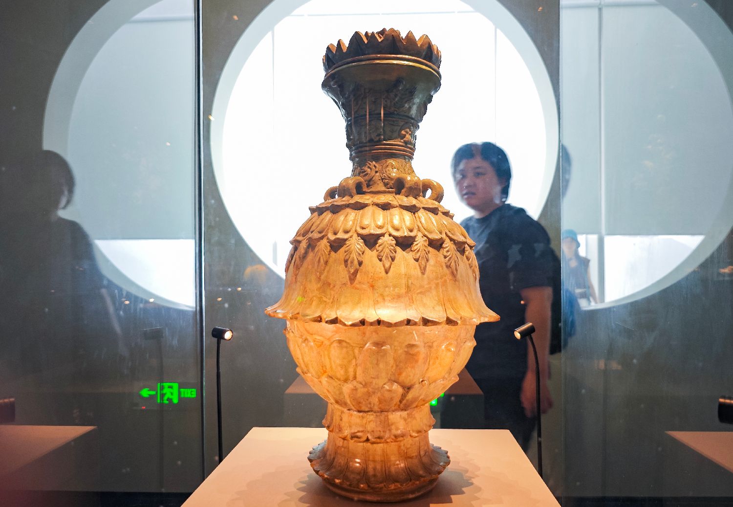 7月30日,观众在南京六朝博物馆内参观展陈的青瓷莲花尊。