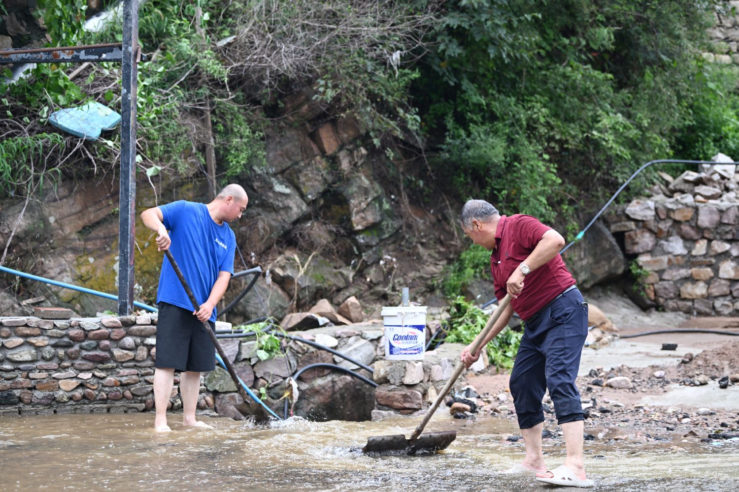 7月29日,村民在天津市蓟州区下营镇常州村排水。