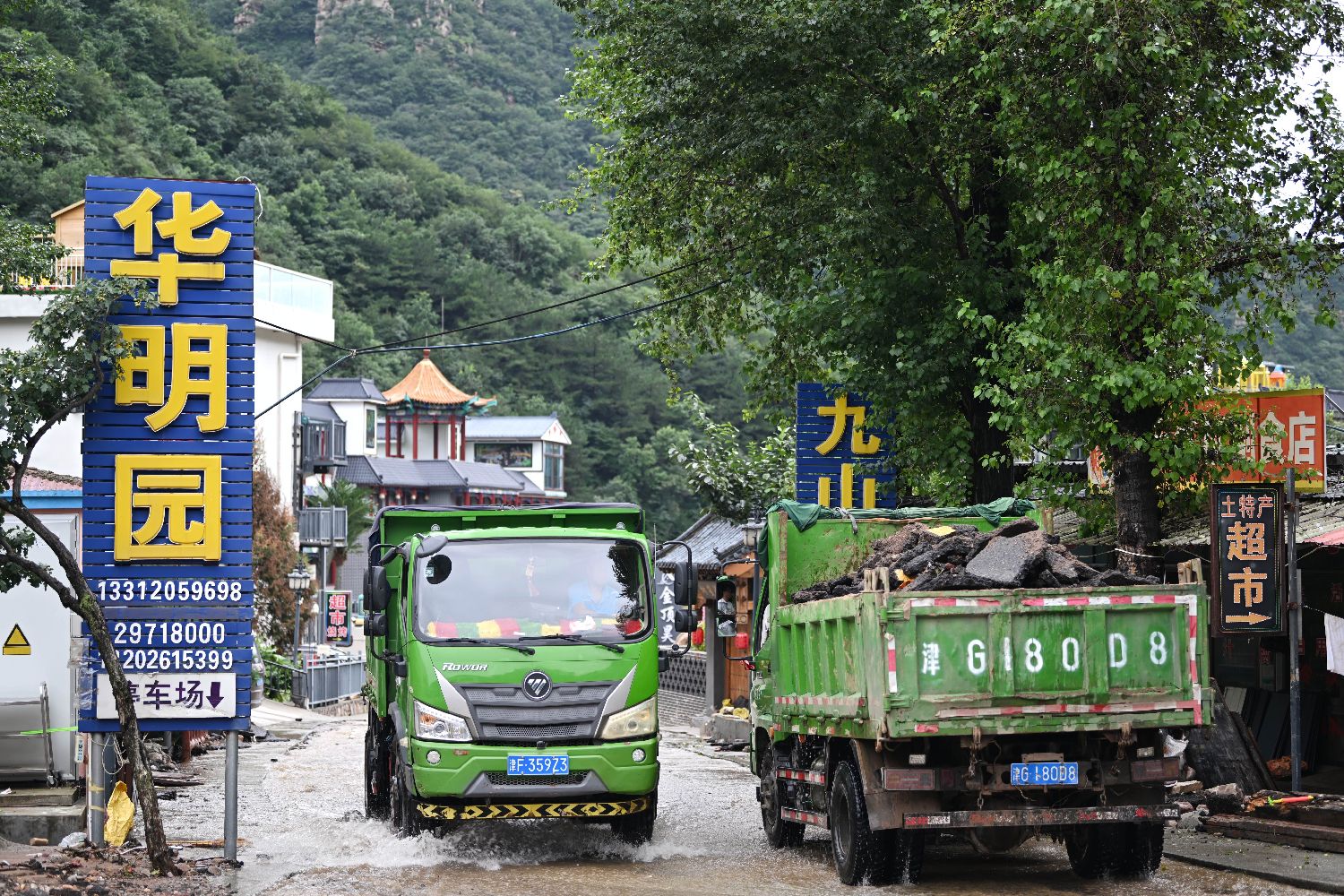 7月29日,渣土车辆在天津市蓟州区下营镇常州村进行清运工作。