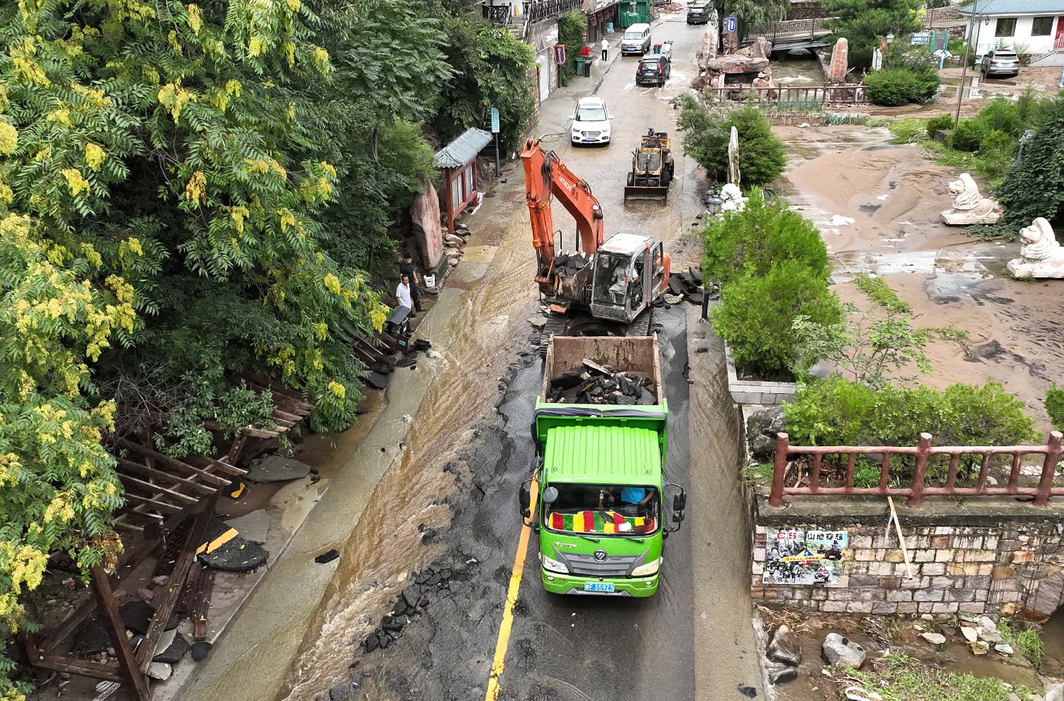 7月29日拍摄的工程车辆在天津市蓟州区下营镇常州村抢修道路(无人机照片)。