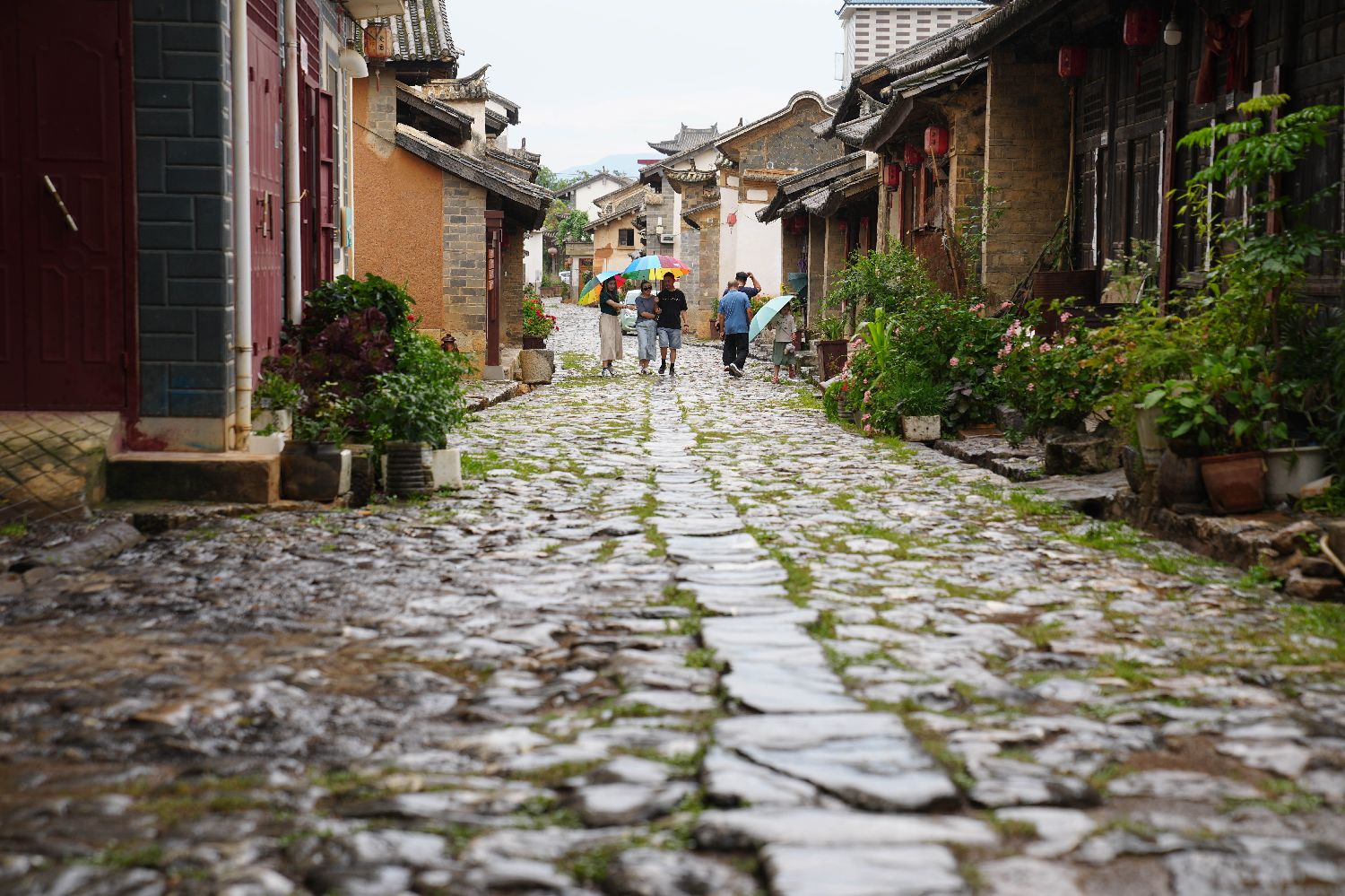 如今,云南驿吸引着四方游客前去,探寻茶马古道、滇缅公路、驼峰航线的历史印记。图为7月30日,游客走在云南驿的古驿道上。(图片来源:中新社)