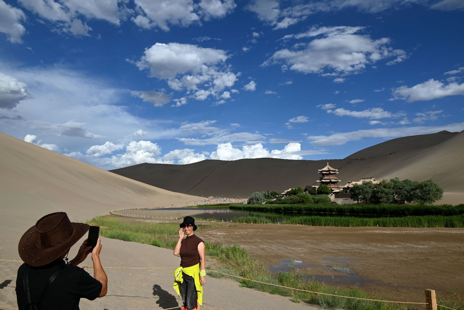 受自然和人为因素影响,20世纪70年代,敦煌盆地区域地下水水位下降,导致月牙泉水位锐减,水域面积持续萎缩,至90年代末,月牙泉平均水深不足1米,水域面积仅剩2.56亩。2011年,中国国务院批准《敦煌水资源合理利用与生态保护综合规划(2011-2020)》。作为规划中的工程,月牙泉恢复补水工程于2016年开工建设,2020年通过竣工验收。图为游客在甘肃省敦煌市鸣沙山月牙泉景区游览拍照(6月21日摄)。(图片来源:新华社)