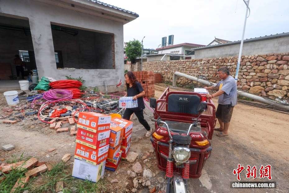 7月31日,处于断水断电状态下的北京市密云区大城子镇北沟村,村民领取救灾物资。