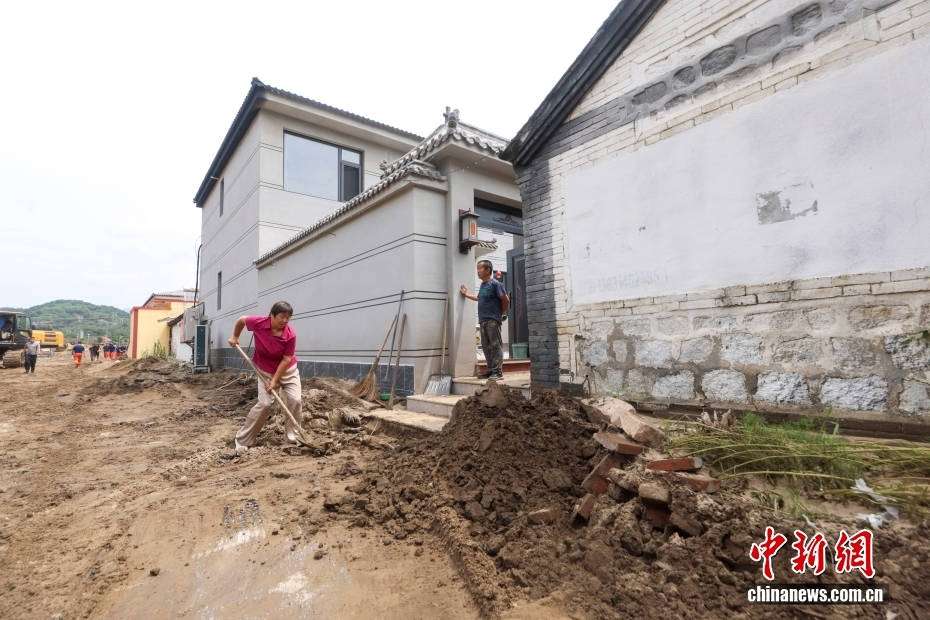 7月31日,北京市密云区冯家峪镇三岔口村,村民清理自家门前的淤泥。