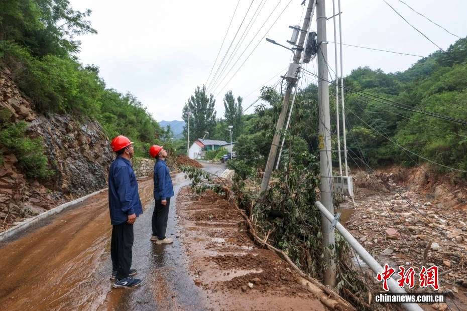 7月31日,北京市密云区大城子镇北沟村,国网北京密云供电公司的技术人员勘察电力设施受损情况。