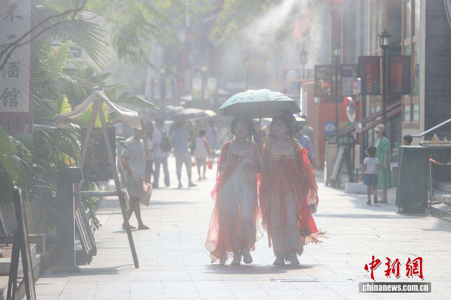 7月29日,江西南昌东湖区,几位身着古装的游客从滕王阁景区门口走过。