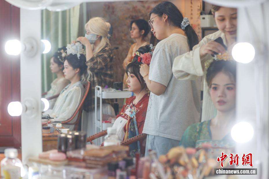 7月29日,江西南昌,几名游客在万寿宫历史文化街区的一家古装体验馆内做古装妆造。