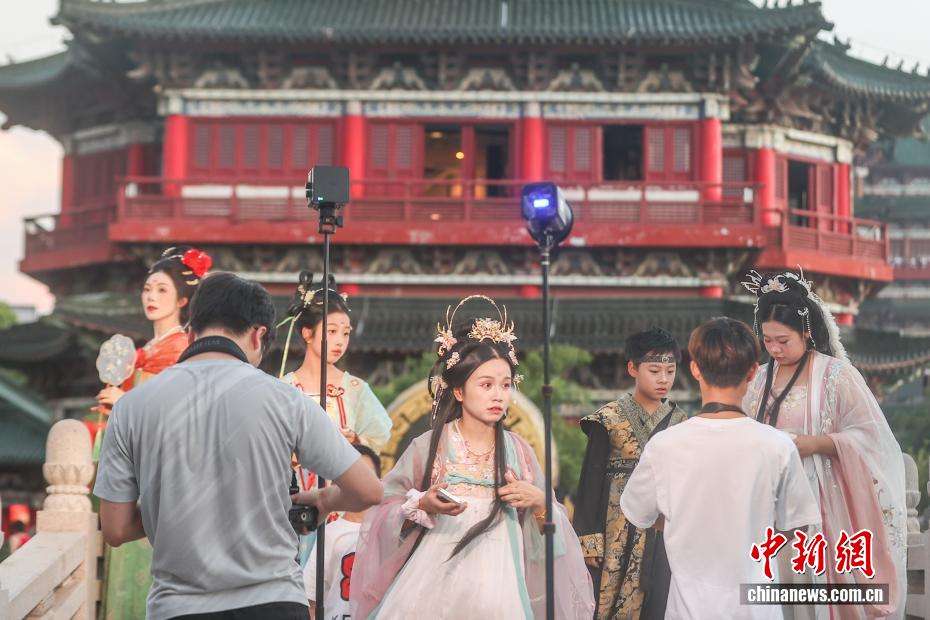 7月28日,江西南昌滕王阁,一位摄影师在指导身着古装的游客如何摆造型。