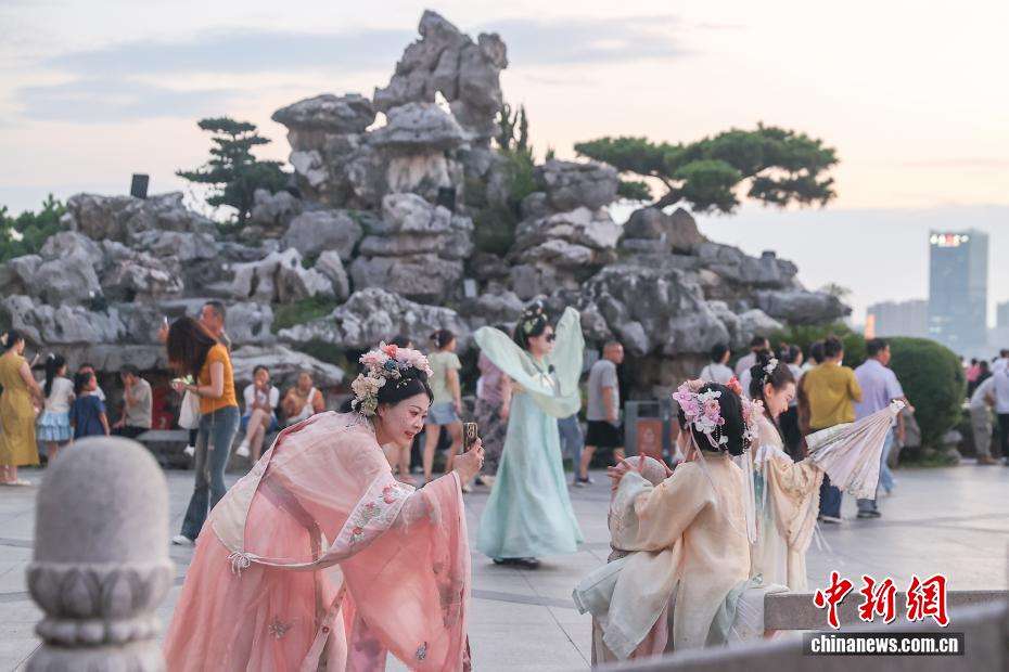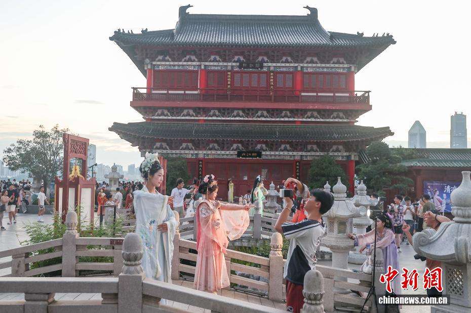 7月28日,江西南昌东湖区,游客白萱和她的几位朋友身着古装在滕王阁北园内拍照。