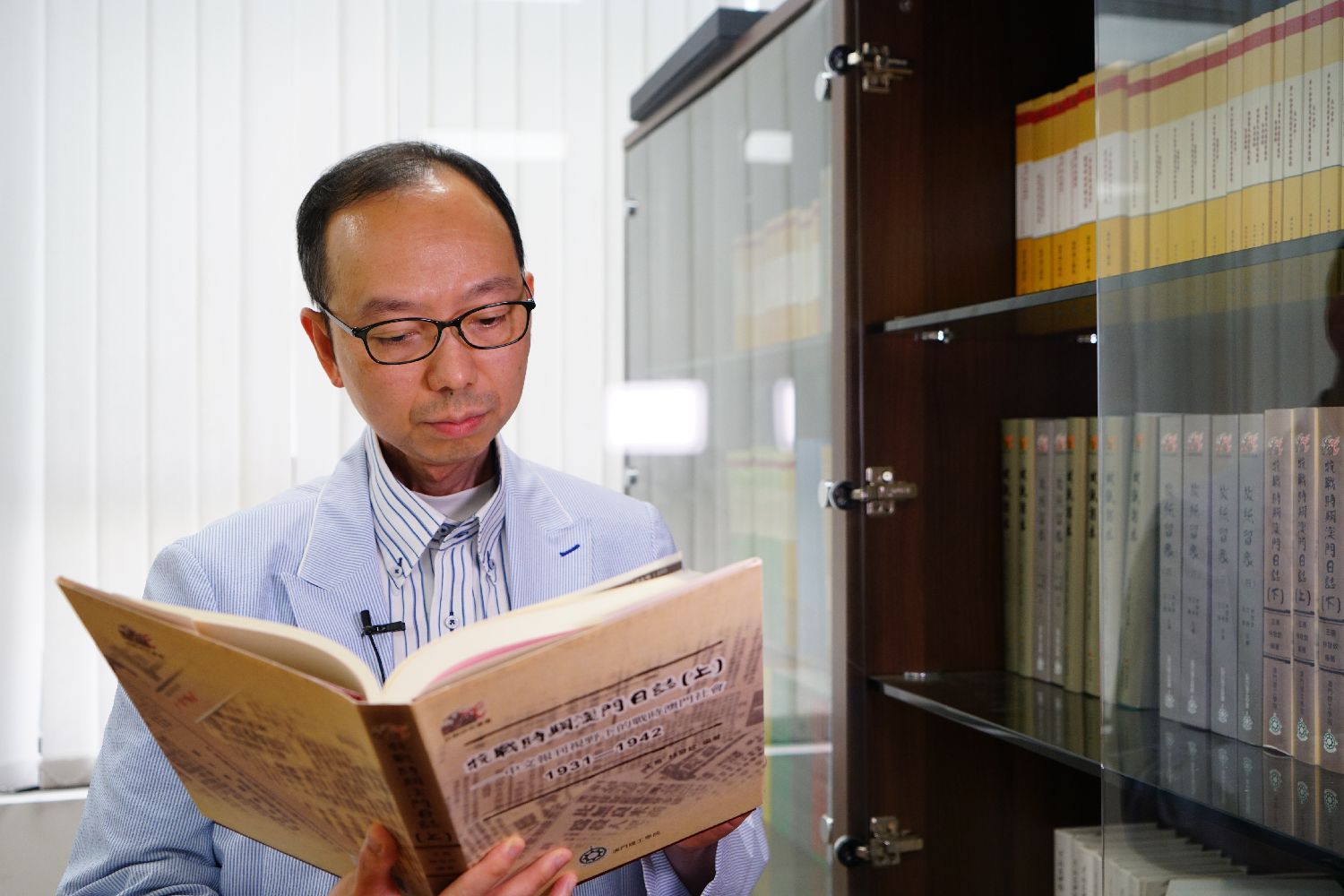7月24日,澳门理工大学人文及社会科学学院院长、澳门口述历史协会会长林发钦翻阅《抗战时期澳门日志(上)》。(图片来源:中新社)