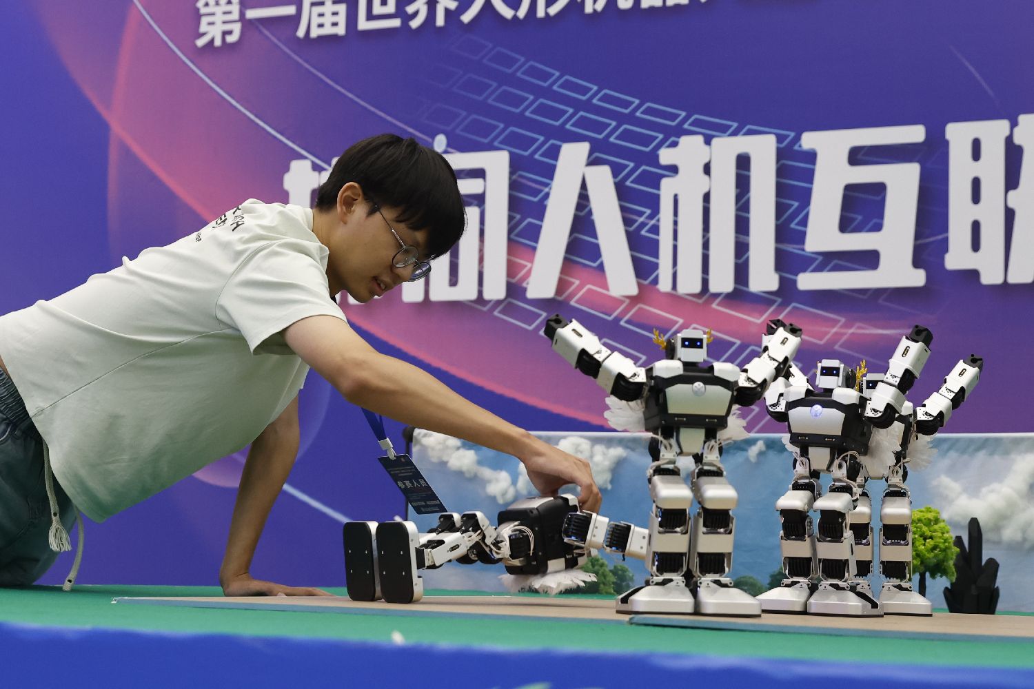 转手绢、单腿蹲、弓步“攀登”……伴随音乐响起,人形机器人队伍在舞台上轮番“秀舞技”。不远处,操控它们的是来自中国华北地区五个省份的高校学生。