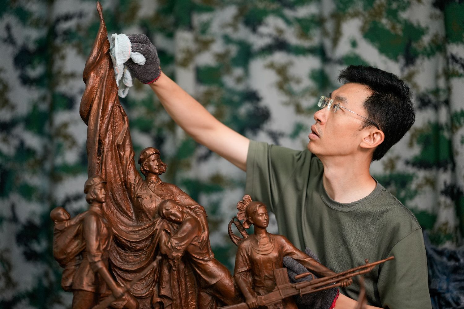 7月17日,解放军文工团雕塑创作员郎钺在擦拭雕塑。