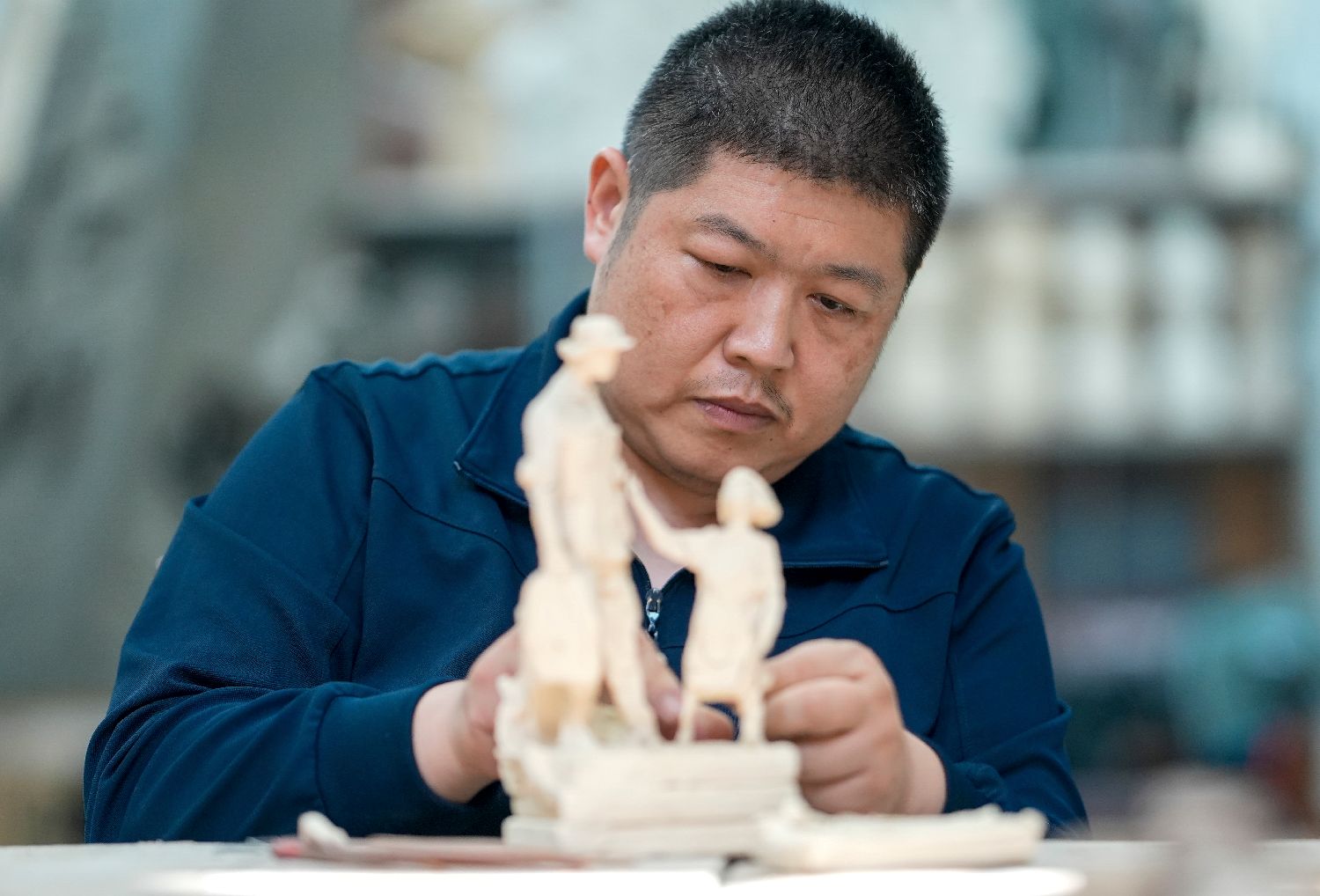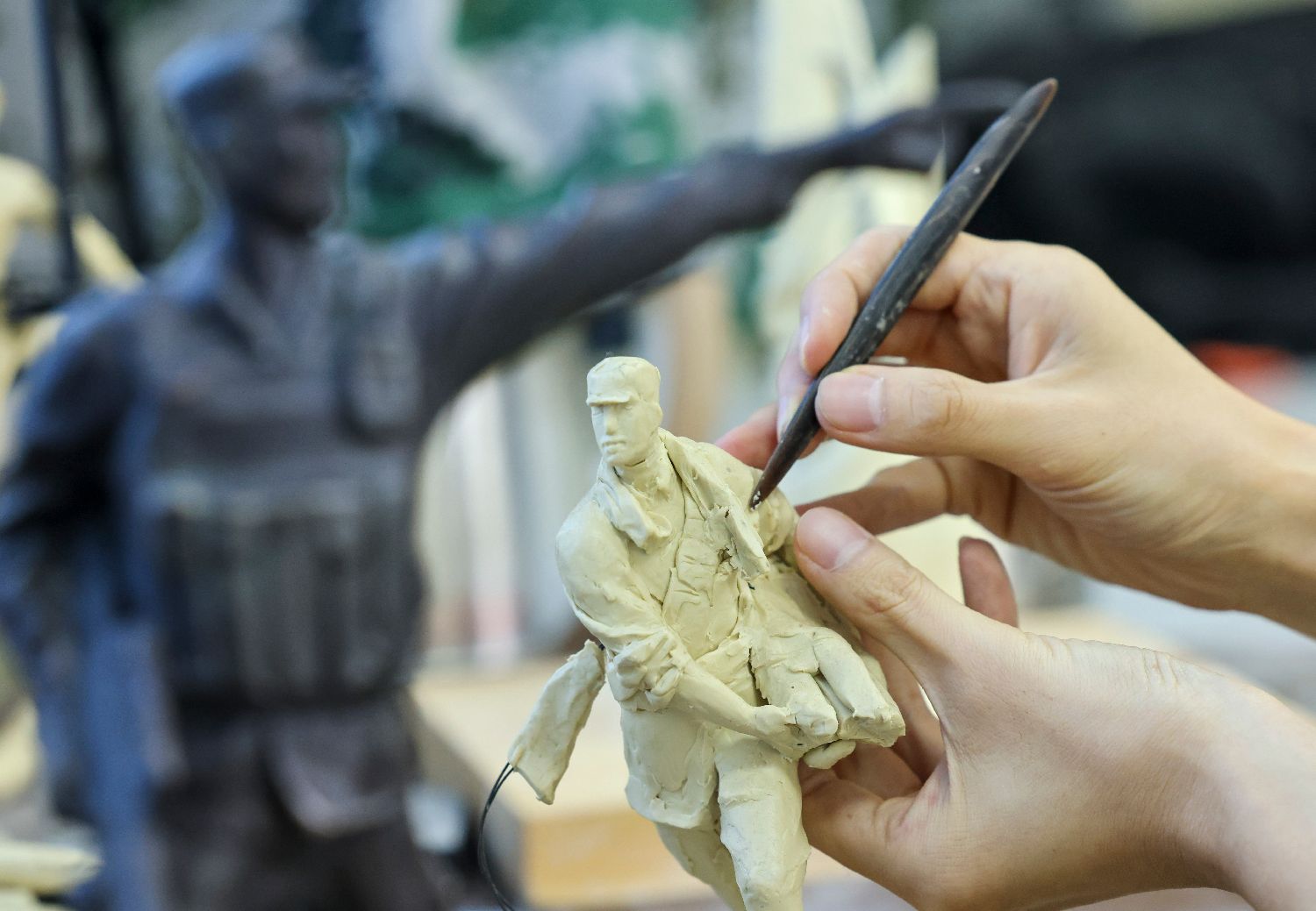 7月17日,中国人民革命军事博物馆创作员谈强在进行雕塑创作。