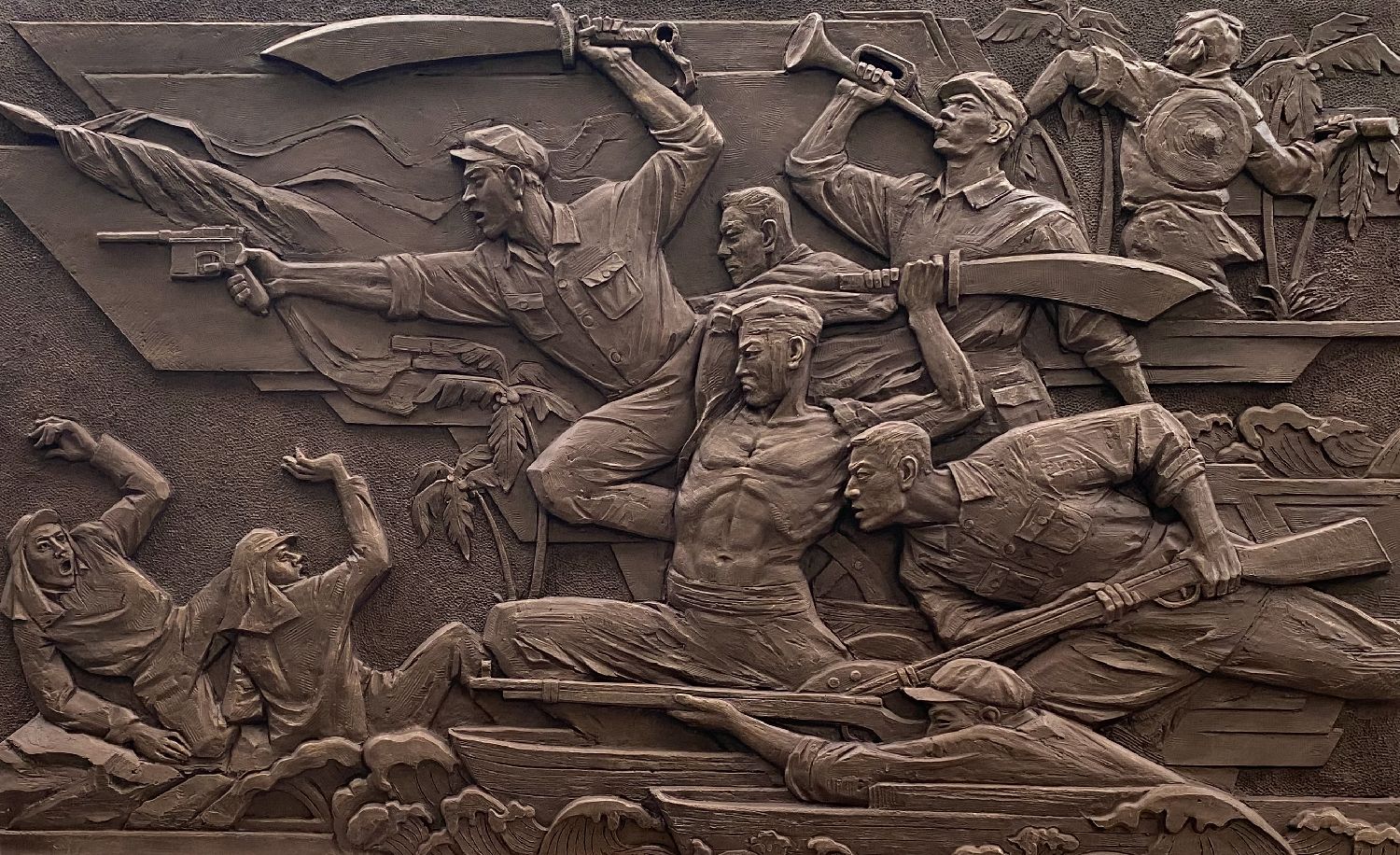 解放军文工团雕塑创作员郎钺创作的,以东江纵队抗战为背景的浮雕《南粤烽火 卫士先驱》。