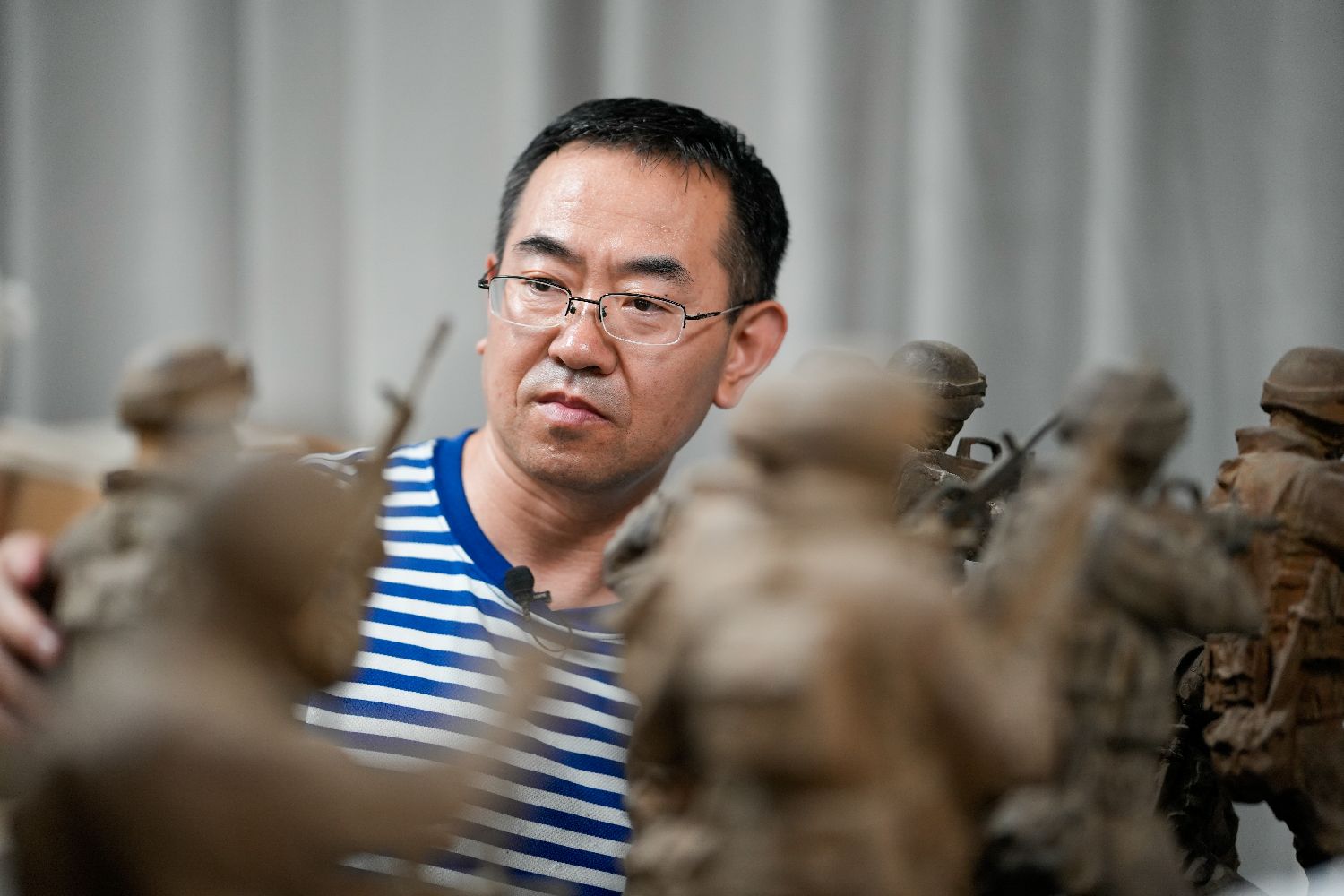 7月24日,国防大学军事文化学院副教授王树山在查看自己的雕塑作品。