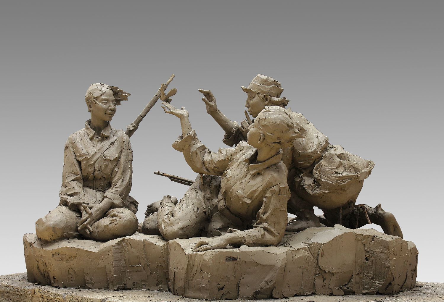 他们的作品有展现东江纵队的战斗场景,有红嫂用乳汁救助八路军伤员的动人故事,也有在中国人民抗日战争暨世界反法西斯战争胜利70周年纪念大会上,抗战老兵和抗战支前模范乘车方队车辆两侧的大型浮雕。三位军旅雕塑家在创作的过程中查阅大量历史资料,走访抗战老兵和他们的后代,前往昔日的战场实地收集素材,用雕塑的形式把伟大的抗日精神具象化,用数十件作品再现了那些山河激荡、英雄不朽的历史瞬间,提醒着每一位观看者铭记历史,缅怀先烈,珍爱和平,开创未来。图为国防大学军事文化学院副教授王树山的雕塑作品《红色记忆》。(图片来源:本文图片均据新华社)