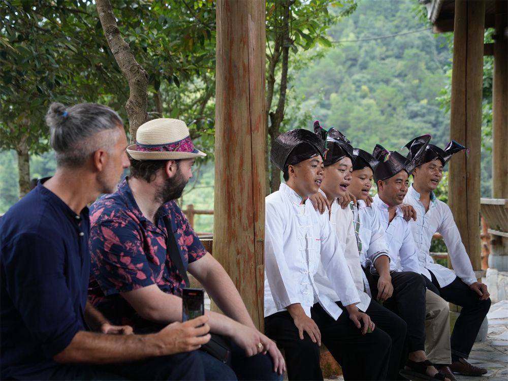 贵州省黎平县黄岗侗寨的村民为外国游客演唱侗族大歌。