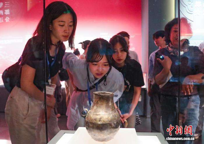 图为日本创价大学学生参观出土于西宁大通的波斯银壶(复制品)。(图片来源:本文图片均来自中新网)