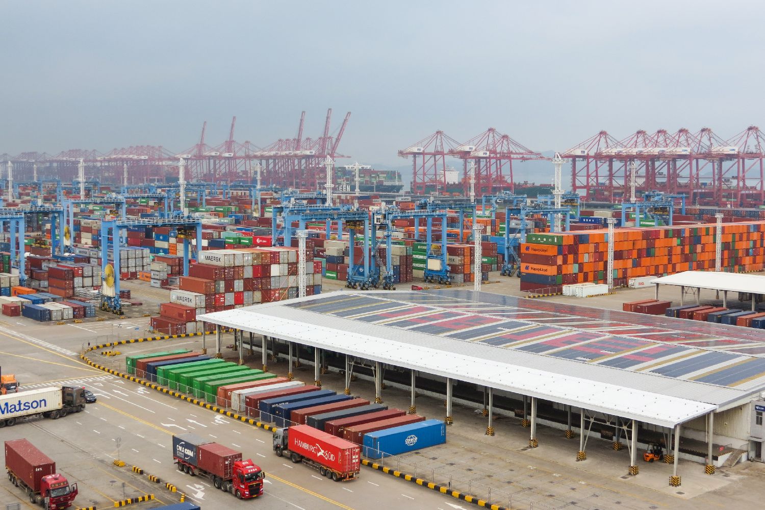 8月4日,新闻记者拍摄宁波舟山港梅山港区集装箱码头。梅山港区不仅配备全球最大规模自动化作业设备集群,也是浙江省首个“绿电码头”,已实现4台风机与屋顶光伏并网发电,累计完成绿电发电量超2600万度,绿电消纳超1550万度。(图片来源:中新网)