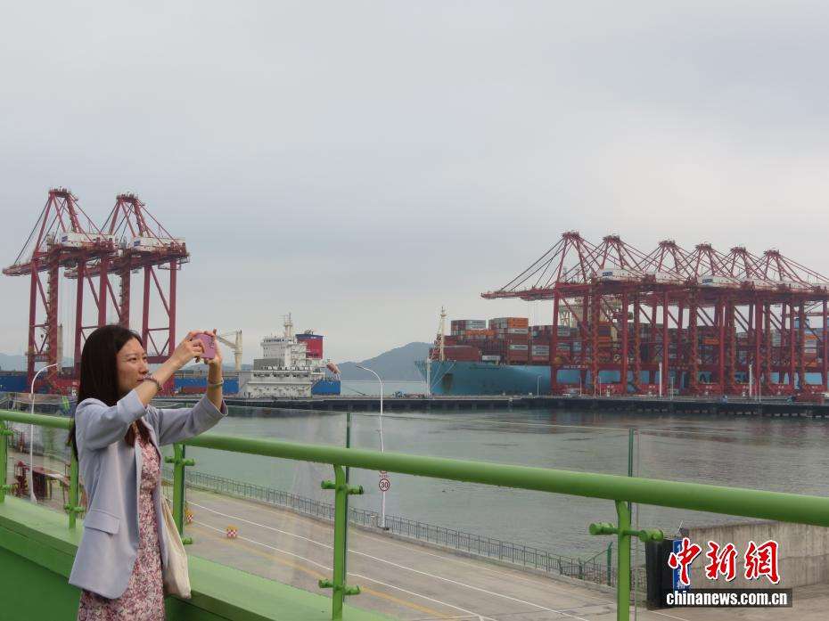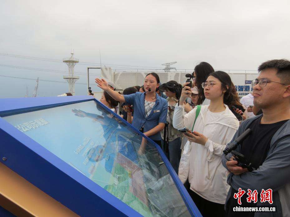8月4日,宁波舟山港梅山港区工作人员向新闻记者介绍港区相关情况。(图片来源:中新网)